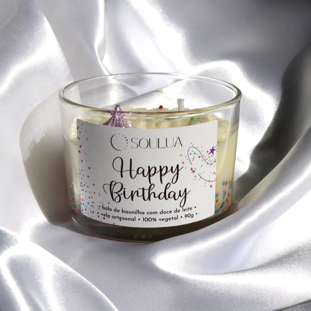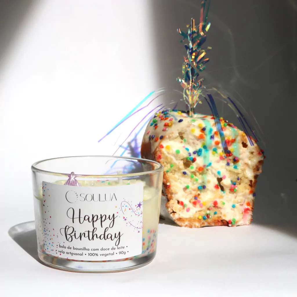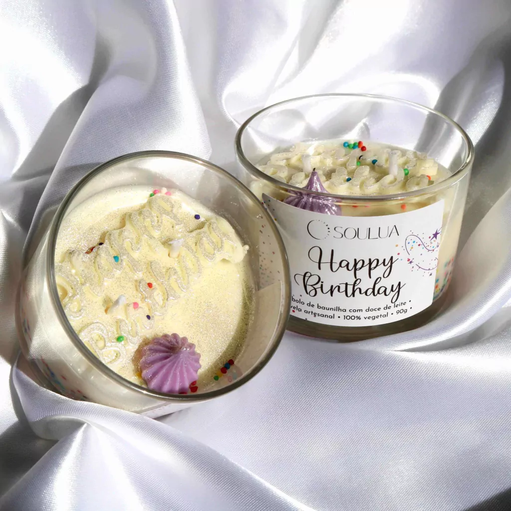 A Vela Aromática de aniversário Happy Birthday é muito especial com um aroma incrível de de bolo de baunilha com doce de leite que acabou de sair do forno! Já imaginou? Como não trazer ótimas memórias?